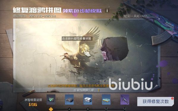 第三个活动是修复渡鸦拼图,大家在游戏时间内将拼图修复完整的话,就能获得紫色的步枪皮肤了.
