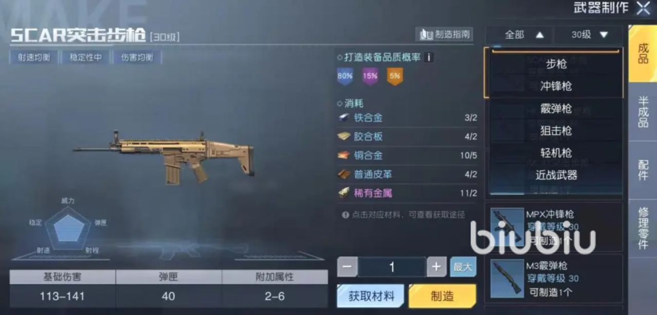其基础的五维面板,我们可以看到其特点也是射速均衡、稳定性中且伤害不高不低,没有什么突出的特色,自然也就没有一些棘手的缺点,非常推荐各位新手玩家作为前期过渡和中期的主力武器使用。哪怕是到了游戏中后期,这个也可以放在第二把枪那里,作为备用枪械。