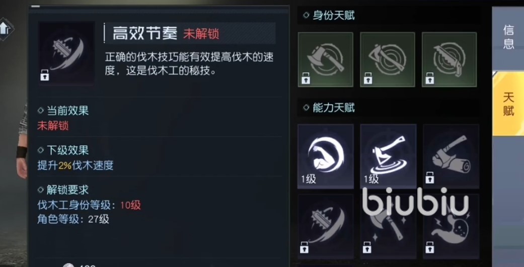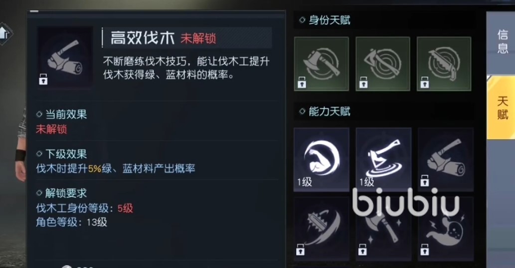升级身份需要去进行对应操作,而解锁的对应的天赋可以提升操作效率(例如伐木效率),例如伐木工这里5级可以解锁高效伐木,提高产出,10级的时候提升2%的伐木速度,15级减少斧头耐久。