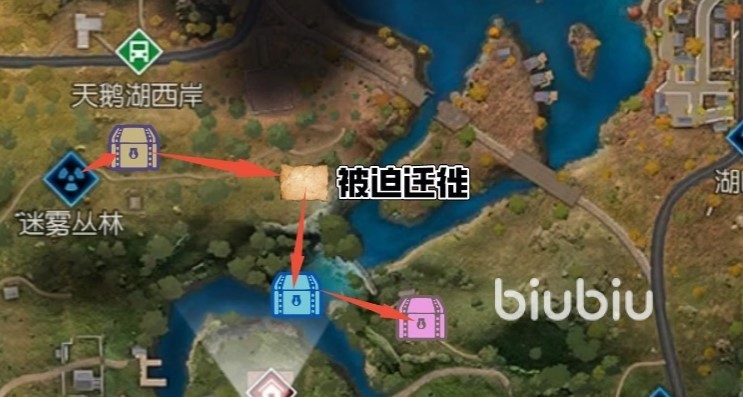 天鹅湖北岸,准备1个急救包,落地后朝左上角走,遇到拾荒者给个急救包获得藏宝信息,沿着河岸走,在一处巨石旁边有一块明显的灰色土壤,挖开就是宝箱啦!