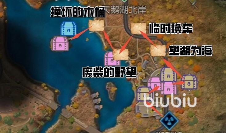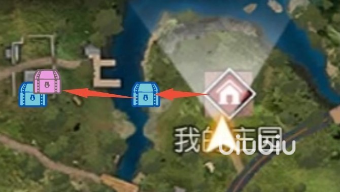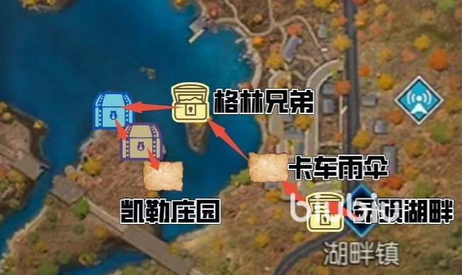 湖畔镇,落地后左侧翻过马路在柱子与绿色箱子中间可以发现一处藏宝点,然后在黄色巴士后房间的2楼床头柜有宝箱,随后在河中小岛上挖石块可以得到宝箱。在附近房区黄色巴士后的房子翻墙进去上楼左手方的房间里也有一个宝箱。