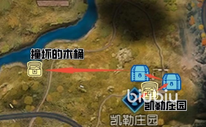 凯乐庄园,落地后东北方向走,在庄园木质楼梯架下面有宝箱,在木梯另一头跳下去有一个地下室的入口,这里也有一个工具箱。