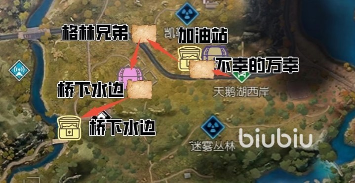 天鹅湖,3个工具箱4个医疗箱3个军械箱。提前准备好一个水煮鸡蛋,从天鹅护西站出发往加油站那边走,里面有军械箱、藏宝图以及挖宝点,三合一的好位置。
