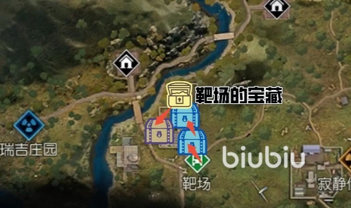 靶场,落地后往地图左上角走,这边有两处地下宝箱,这里的两处箱子还是很好找的。在许多靶子的地方,顺数第五个靶子就是藏宝图的挖宝点。
