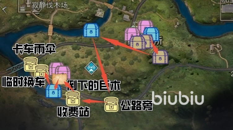 红木林地地图非常打,我们先从迷雾丛林出发,这张图有1个工具箱1个医疗箱1个军械箱。到传送点后从小地图右上方也就是东北方向走,可以看到有许多堆起来的油漆桶、集装箱,在这里就可以找到一个军械箱。然后往右走可以发现一个遇难者,有藏宝图。
