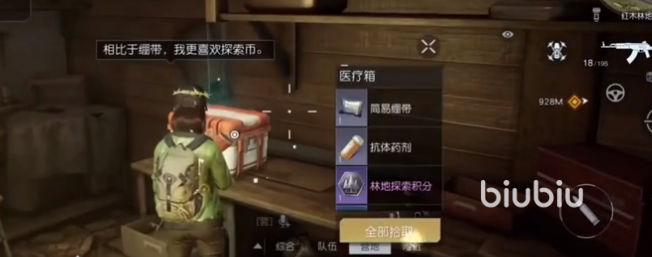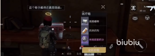 在这块区域各位能够获取到两份医疗箱,其中一个的位置是在(5308,-4202)处,也就是间房子里面,各位进入之后就会看到在桌子上方的红色箱子。靠近它就能够获取到绷带,药剂等奖励,都是能够拿走的。