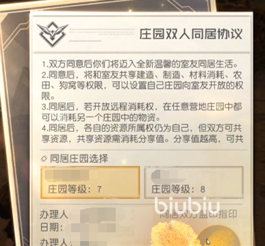 邀请发送过后被邀请的玩家接受即可同居,不过被邀请的玩家也是有限制的,那就是只能邀请营地庄园7级以上的玩家,且这个被邀请的人必须要和玩家在一个队伍中,这个队伍只能有两人,不能多,并且他和玩家的亲密度也要达到100,被邀请者只有满足这些条件才能同居。