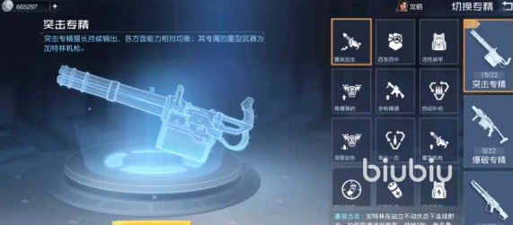 之后是突击专精,突击专精对应的武器是重机枪、无人机这一类高火力武器,突击专精的效果是增加高火力武器中远距离的伤害,如重机枪这种武器,无人机的话则会提升无人机的攻击距离,加点方面推荐加点是百发百中、活性装甲、步枪精通、幸运一击,这一套点出来以后基本上可以实现全程无需换弹的效果。