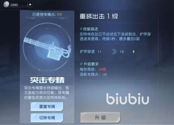 专精目前有三个,分别是突击,爆破和辅助,从字面意思上来看也算是区分得很明确了,解锁不同的专精会获得独特的重武器,突击中就是加特林,以持续的高目标伤害为主,属于下副本中对boss特化的职业。