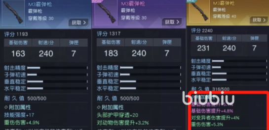 从下图中的属性对比上可以看到,同类型的三八武器中金色武器的基础面板要高蓝色和紫色很多,综合评分也要高蓝色和紫色很多,而蓝色和紫色武器之间差距却不是很多,他们两之间的基数面板相差也就是20点,另外从附加属性上还能看到紫色和蓝色的武器附加属性只有两条,而金色武器确有四条,其中有两个属性还是紫色,并且还能看到武器的等级上限也不一样,蓝色紫色的武器上限只有30级。