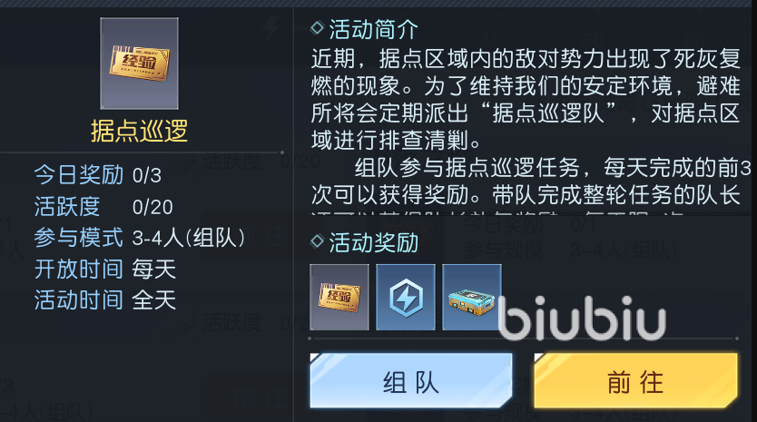 这个任务的流程不难,只要完成三个据点的任务挑战就行了,有特殊情况的队员还可以向队长申请挂机。此处可以获取到的奖励是比较高的,并且对于玩家的等级限制也比较低,这里的奖励还是每次完成一个据点任务之后就会发放的,大家不要错过了。