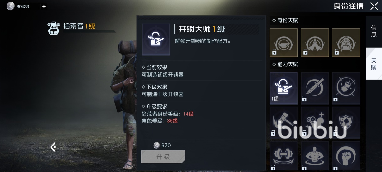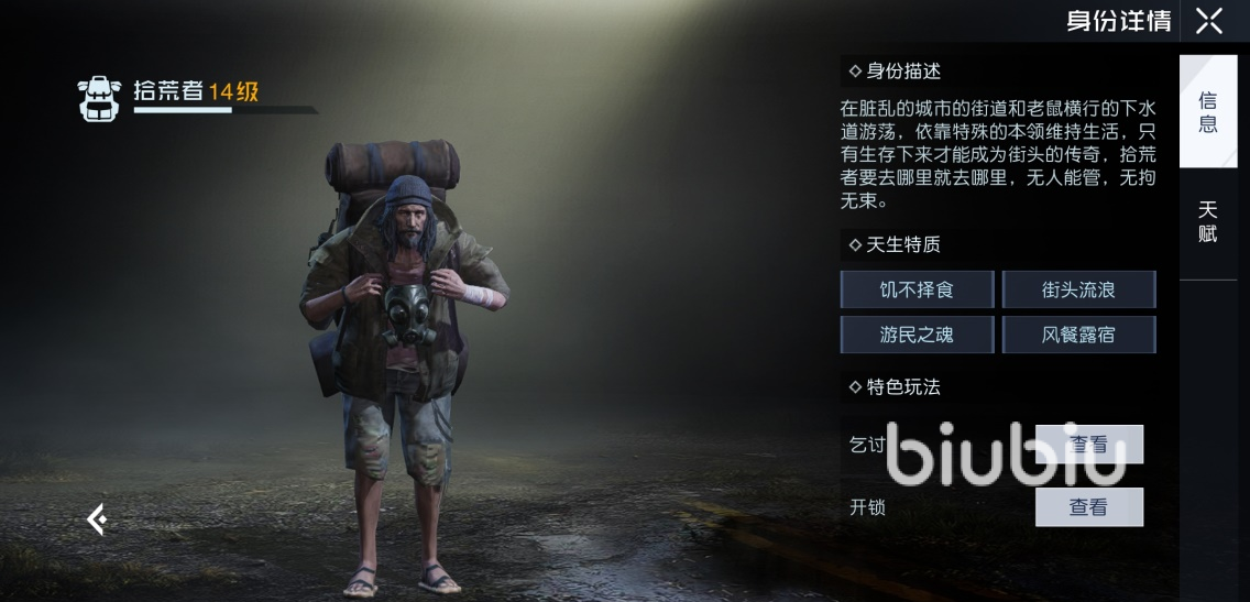 此游中的身份需要大家在达到对应的等级之后才会开启的,其中一些比较常见的技能就是一些生活中需要用到的,其中的拾荒者就是通过达到等级可以解锁的身份,各位随着使用的熟练度逐步提升,它的等级也就会越来越高。
