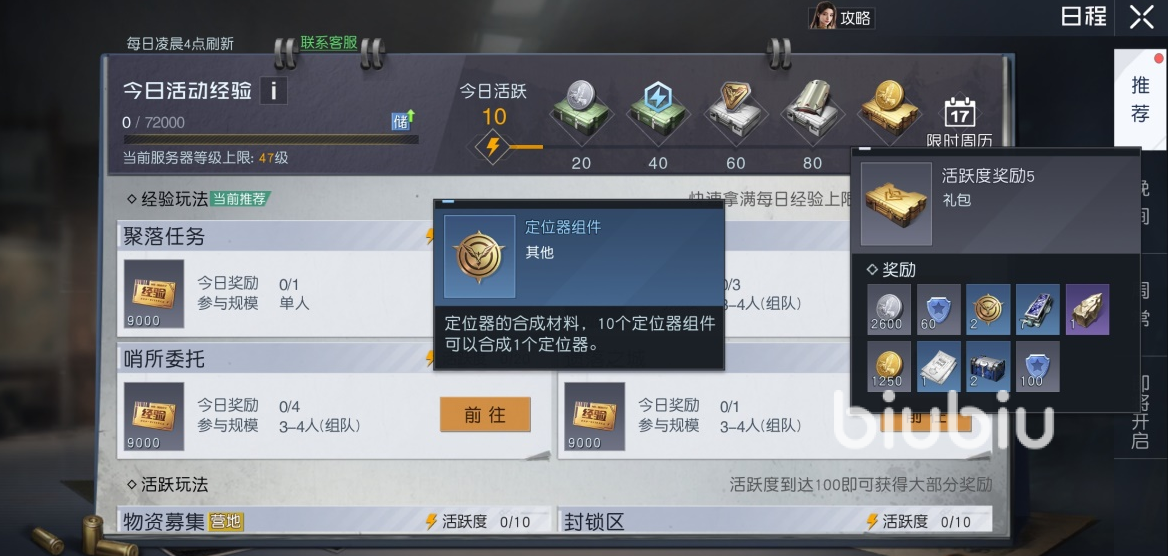 这里的定位器是可以通过组装合成的,其中需要用到的部件可以在每日的活跃度奖励中领取,每十个部件就可以合成一个定位器,这也是当前主要的获取方式。有时候在其他的玩法中也会有部件可以获取,不过这是概率性的。