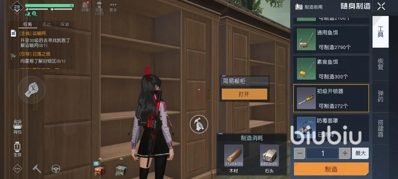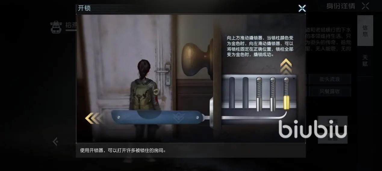 如果身上有开锁器,这时与门互动就会额外出现开锁的按钮,开始后会进行开锁小游戏,成功后开门,失败的话消耗一枚开锁器。上锁的门也会高概率出现在房间中,进入有家具的房子,找到像能存放东西的家具处就可能出现撬锁按钮。
