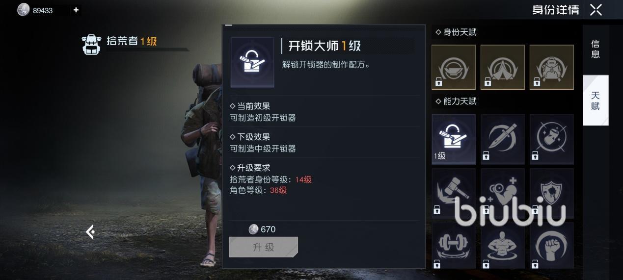 通过熟练度进行升级,同时也是为撬锁和乞讨时能获得更高收益。其中撬锁是解谜小游戏,身份等级越高,就可以制造更高级的开锁工具,玩同个撬锁谜题时的难度就会更低,开锁收益也更高。而且开锁工具也能卖给其他玩家来赚取收益。