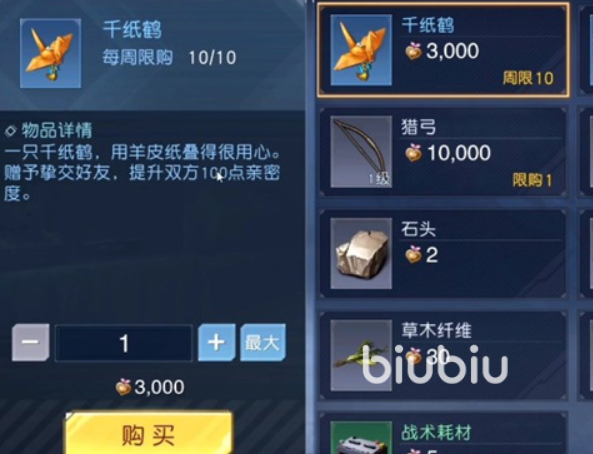 第2种方法就是在游戏当中购买礼物,赠送给好友了前往杂货铺之后,我们可以在杂货铺当中购买千纸鹤或者玫瑰花,购买之后这些东西就会存在于玩家的背包,当中赠送给我们,希望赠送的玩家就可以增长相应的亲密度了。