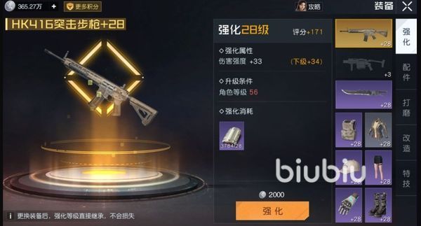 在这个游戏中当大家获取到一个装备之后,通常它的强度并不是很高,但大家可以通过后天强化将它变得更厉害,比如hk416突击步枪升到28级之后还会再加上28,评分也会加上171,伤害会加上33%。