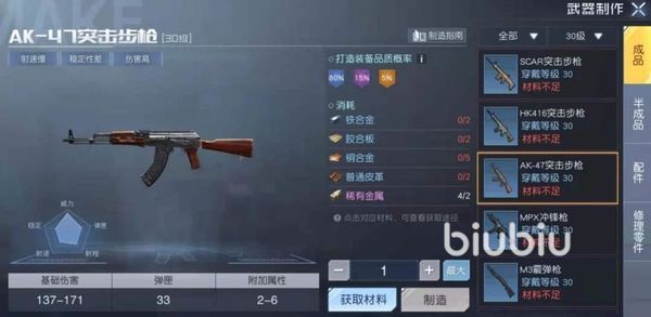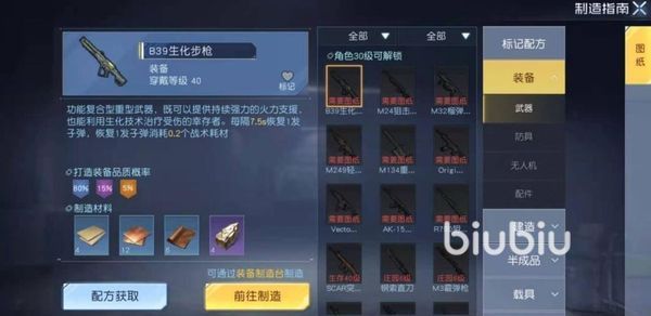 在这个页面中,有三个选项,分别是武器制作,装备制作以及无人机制作,大家可以选择自己想要制作的工具,然后点击进去,就比如武器制作点进去之后,就能看到各种各样的武器,在这些武器中,找到自己最想要的那一个点进去,收集齐材料,点击制作就完成啦。