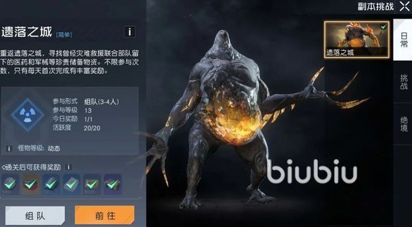 注意一下,它每天都是不一样的,完成一个之后,大家就需要等到第二天,才会刷新出现新任务了,除此之外这里还有很多的副本日常活动需要大家去参与一下,在这里若是大家完成通关,也能获取到大量的奖励哦,而且大家还能去选择是组队还是个人游戏,全按照大家的喜好进行就可以了。
