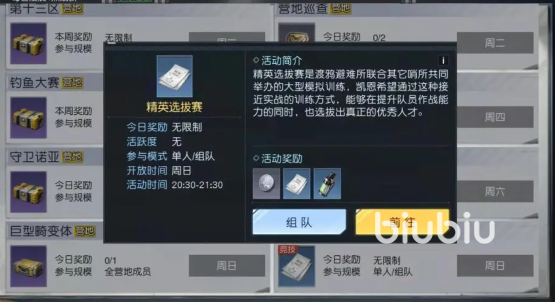 这个副本的前提条件跟上面的那个差不多,不过时间改为了星期四八点半,需要玩家们参与,等级达到35活动开启之后,玩家们要前往相应的地图去消灭变异体。简单来说,就是玩家们带领自己的营地与其他营地一起去刷世界boss,然后有次数限制,而且仇恨属于首次发起攻击的那一方,奖励也是属于那一方。如果那一方营地被消灭或者是转移了,那么仇恨将重新计算。整体来说就是先到先得,而且对实力有一定要求。