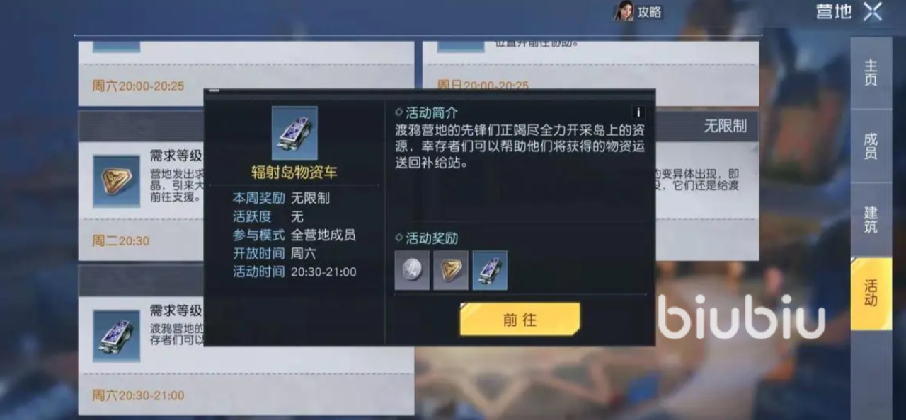这个模式其实严格意义上来说,如果各位玩家没有加入营地的话,是不能开启这个任务的,算是营地专属任务。与每个星期六晚上八点半开放等级35级活动开启之后,在相应的辐射岛副本中会刷出不同品质的物资车,玩家们需要将物资车沿途护送到我方补给站获得奖励,期间踢人会不断派出杂鱼攻击和冲击物资,需要玩家们提前做好准备。