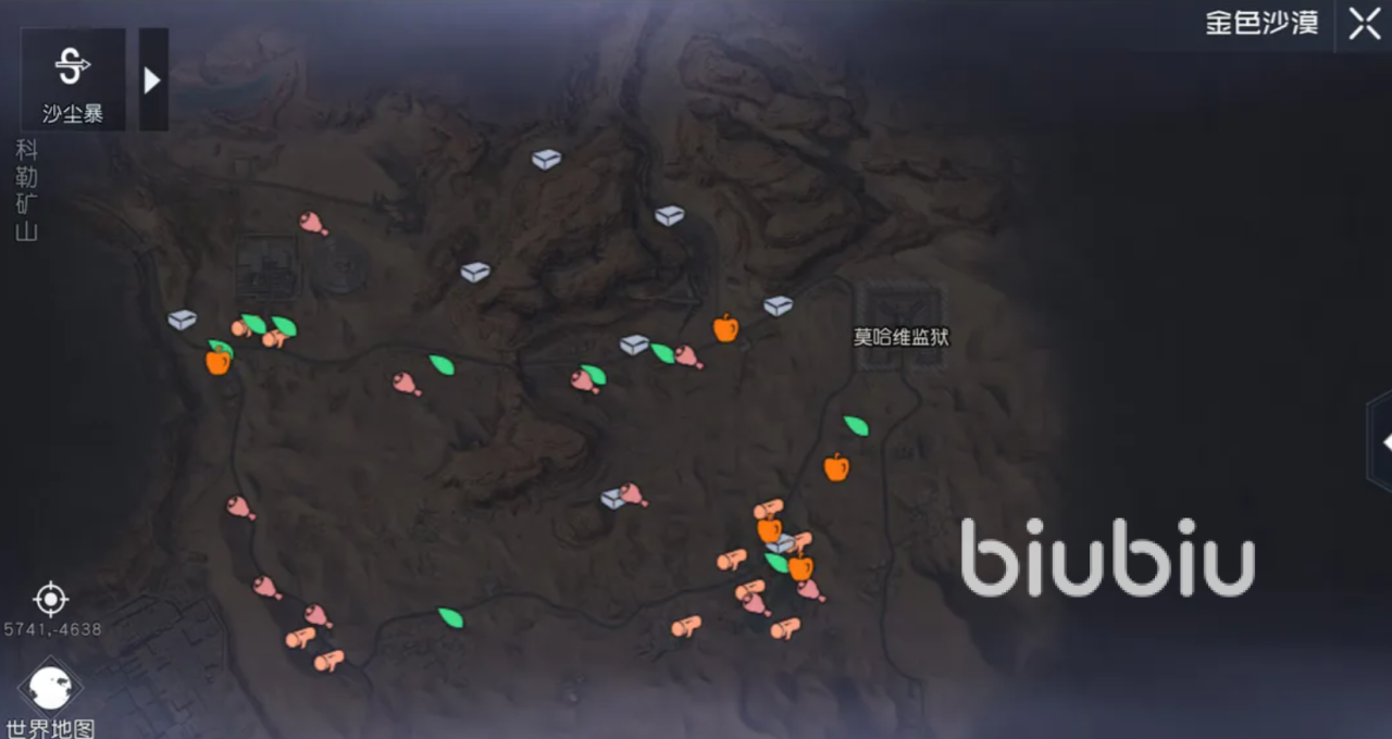 当然,如果各位玩家觉得自己实力还不错的话,可以前往沙漠地区到地图的下方寻找资源。玩家们沿着监狱一直向南方前进,在正南方偏西一点的地方,如图所示,可以看到资源扎堆,觉得自己实力不错的话,可以来这里刷资源,而且有非常多的木头。