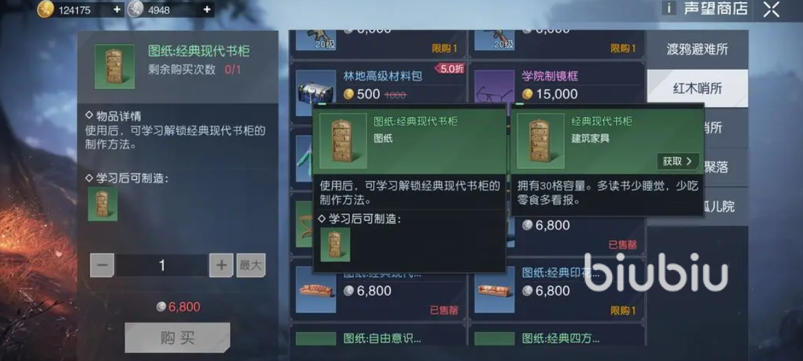 此外家具方面,储存物品的家具有数量限制,而且这个数量之后不会变多,所以前期的话各位可以按照自己的需求造家具。这边推荐声望商店那个现代书柜,30格的超大容量能帮助各位玩家前期存纳更多的东西,甚至到中期都是完全够用的。