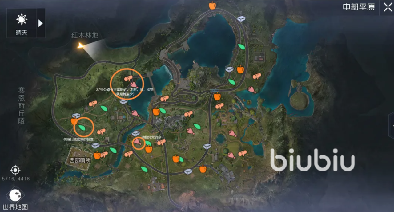 首先,面对这种情况,推荐各位玩家们去27号公路这个传送点车站下来,只要一直沿着马路前进,就能在马路旁边收集到不少的资源。基础资源方面有着非常丰富的矿和木头,也由于靠近水岸,鱼和动物的分布也比较多,除了棉麻这种植物资源少以外,基本上绝大多数的材料都可以在这里收集到很多。