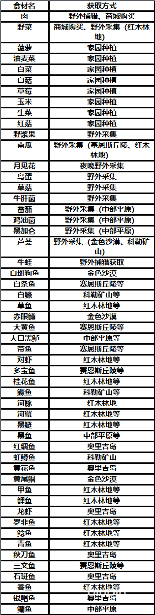当然还有部分食材的获取方式,这里也一并给大家介绍一下。