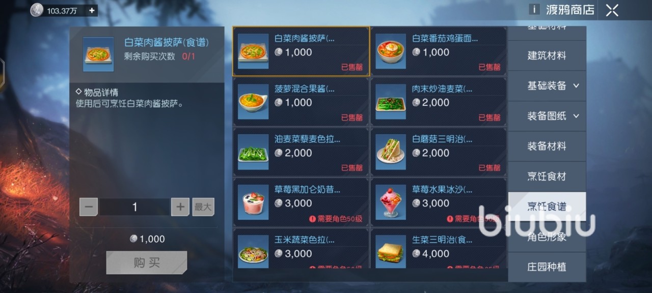 随着幸存者等级的提升可以在渡鸦商店里也可以购买各种烹饪食谱,一般食谱的价格也就是2-3K。此外食堂内的商店也有食谱在卖,而且其等级高了之后,能买到的食谱。注意一下,这一类的料理是不能通过简单的食材组合来点亮的,背包中只能带20个料理,那些多余的可以先放在仓库里存着。