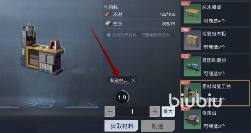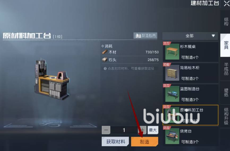 此处的这个工具台的获取方式比较简单,就是在建材加工台中进行制作,它在此处的家具选项里,只需要消耗一定量的石头和木材就可以了。完成制作以后比那可以将其放在合适的地方,然后就能在此处进行材料的加工了。