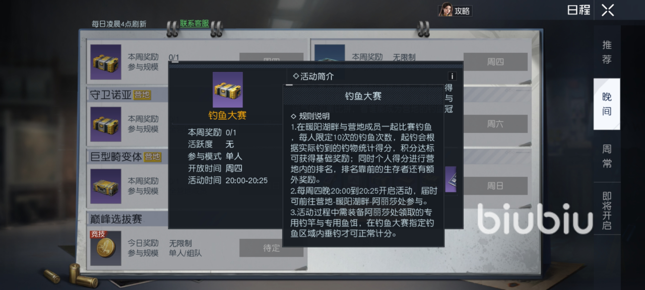 后期各位的等级提升上去之后便可以去参加营地中的一个钓鱼比赛活动,参与这个活动需要使用专门的鱼竿还有大赛专用的饵料,并在指定的位置钓鱼才可以获取这里的积分,这个活动只有周四的时候才会开启,同时持续时间只有二十五分钟。