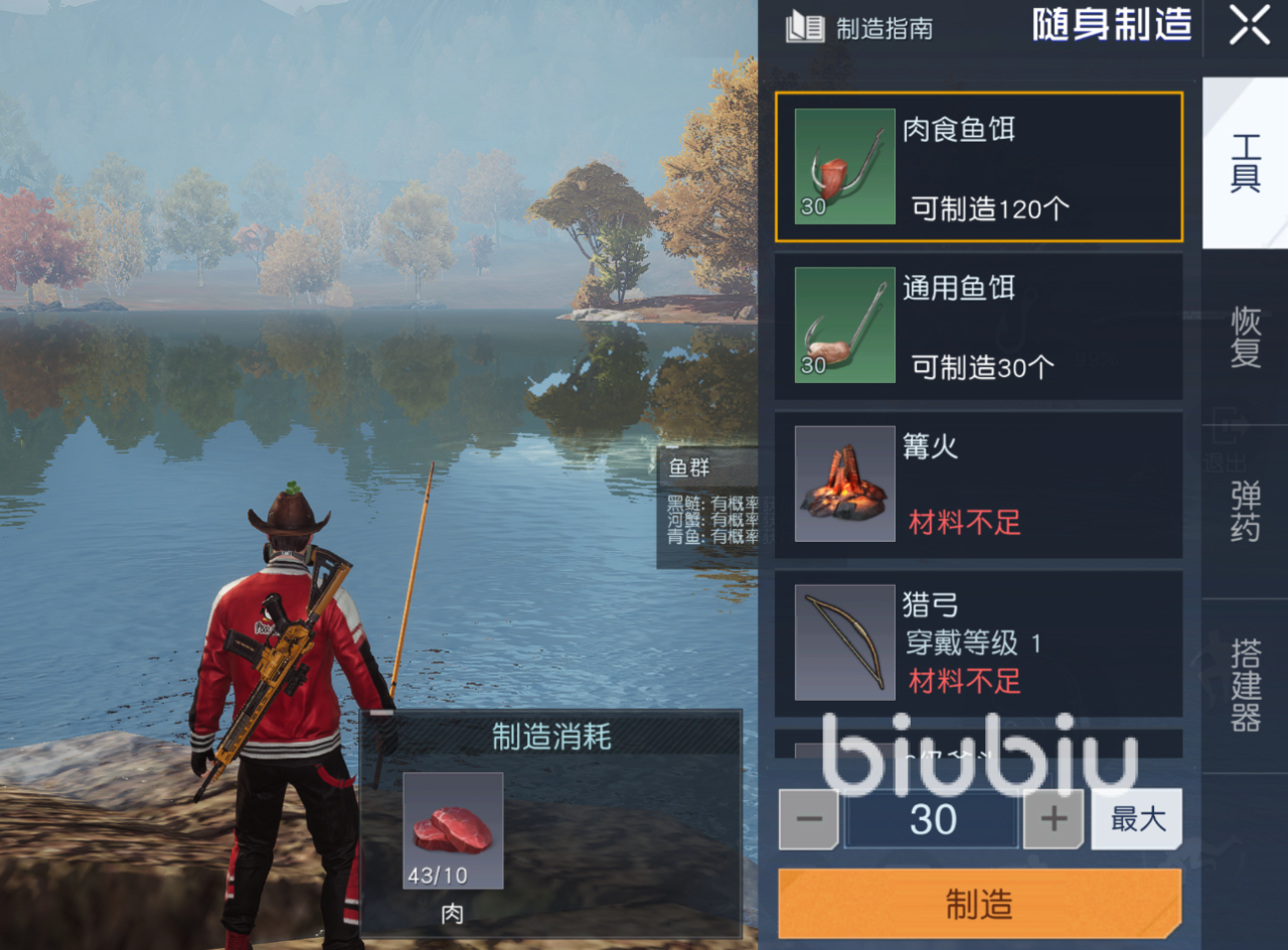 当前这里的鱼饵都是需要玩家自己制作的,在这个游戏中基本每个东西都是可以通过制作获得的,这里的鱼饵就是需要在随身制造的工具里面打造出来,其中它还分为杂食,肉食,通用,还有素食这四种。