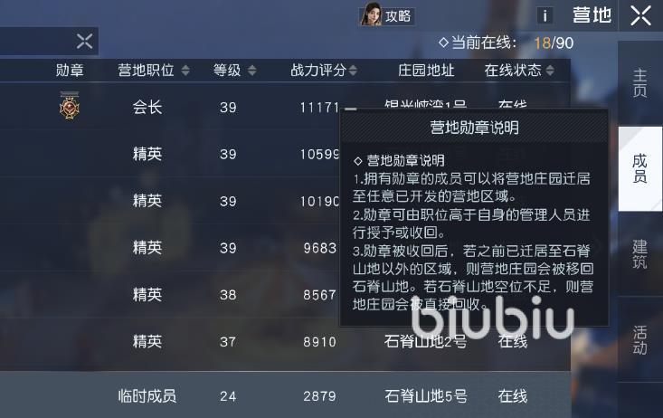 加入营地后,打开营地面板中成员,会发现营地成员中有会长前面会显示有营地勋章。在每个营地中,会长必有营地徽章,其余徽章就是靠徽章来授予的,目前游戏版本中,营地勋章暂时无法通过其他途径获得,只能是营地创建者也就是营地会长来授予,其他成员没有这个权限。