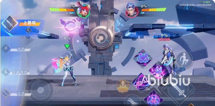 冲刺的时候使用普攻,安琪拉会向前突进,并且打出旋转攻击将对手击飞,这个击飞的幅度是比较小的,所以比较建议接上连招一起使用;处于空中的时候普攻有三种形式,跳跃之后普攻可以攻击前方的敌人,空中上滑普攻会扔出一个炸弹,对敌人造成伤害,下滑普攻会向下俯冲攻击敌人;滑动并且按住普攻不放可以进行蓄力,从而积攒恶魔炸弹,发射之后对路径之上的对手都造成伤害,蓄力满了之后就可以打出猛击,炸弹会被强化成电子熊,弹道的速度更快,同时造成的伤害也更强。