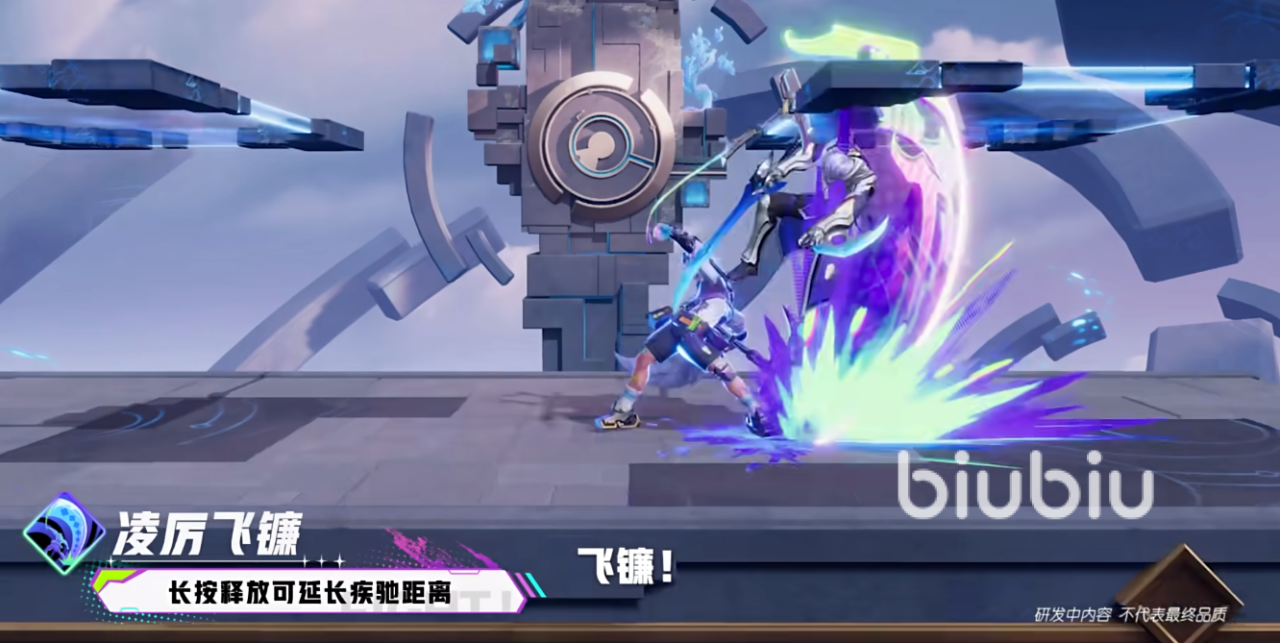 二技能凌厉飞镰:向前快速疾步行,向后甩出飞镰,进行半扇形的攻击,对命中的敌人施加高额伤害且有小段控制的效果。很适合冲击接近敌人之后,拉近身距打输出。