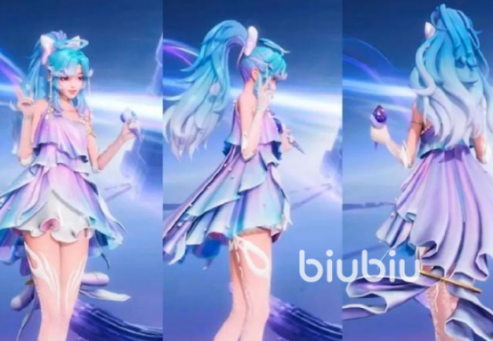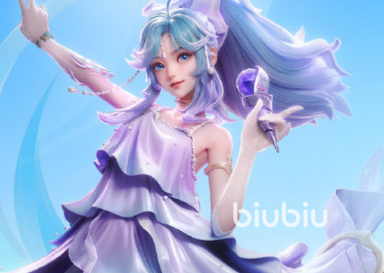 这款皮肤和音乐有着直接的关系,配色偏暖,往往是不会有特别艳丽的颜色,而且是高马尾的设计,身上的长裙略微透出了一股紫红色,面部的造型非常的可爱,手拿着麦克风能唱出一首首关于海都的曲子。