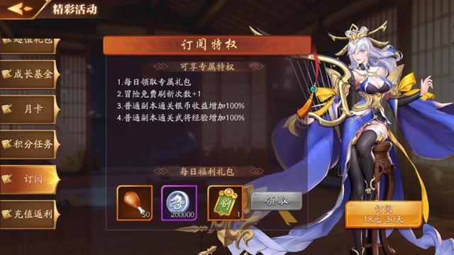 这一个早期必购买,每一天50体力和银币全都是咱们很需要的物资,价钱为18。