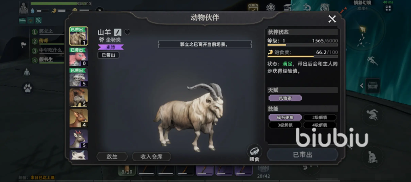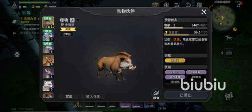 骑上二师兄后,也是比较简单的,找到树木,直接对其冲撞,就能获得对应的经验了,多次进行砍树和矿石采集的操作,就能迅速累计经验了,不过需要记住,不管是山羊还是野猪,都有饱食度,需要将其喂饱后,它们才能进行工作。