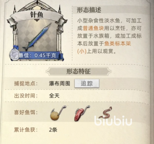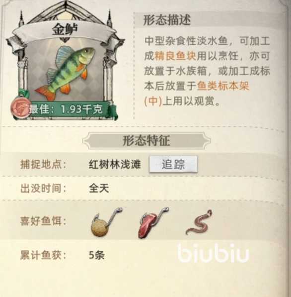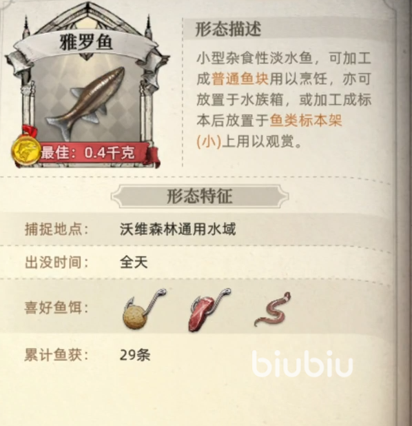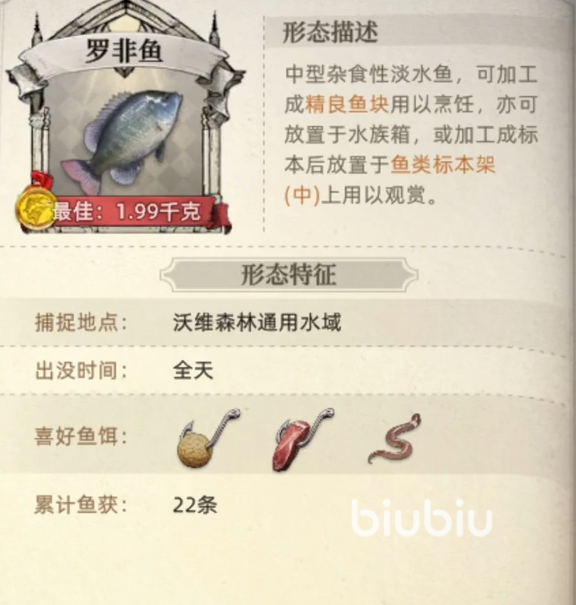 这个是属于小型的淡水鱼类,也是大家在前期最容易遇到的鱼。这个鱼可以直接出售,也可以自己加工成普通的鱼块来进行烹饪,也能放入水族箱里面来观赏或者变成鱼类图鉴。这个鱼类在沃维森林之中到处都可以看得到,鱼饵的话则是普通的蚯蚓或者是面包屑的鱼饵就行。