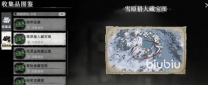 第二张为雪原图纸,大概位置位于雪原群山位置的山脚下,第三张为荒原图纸,大概位置就在荒原靠近湖泊的位置,在湖泊凹陷的点位上,最后一张图为隐岸图纸,位于湖岸边凹陷位置处。