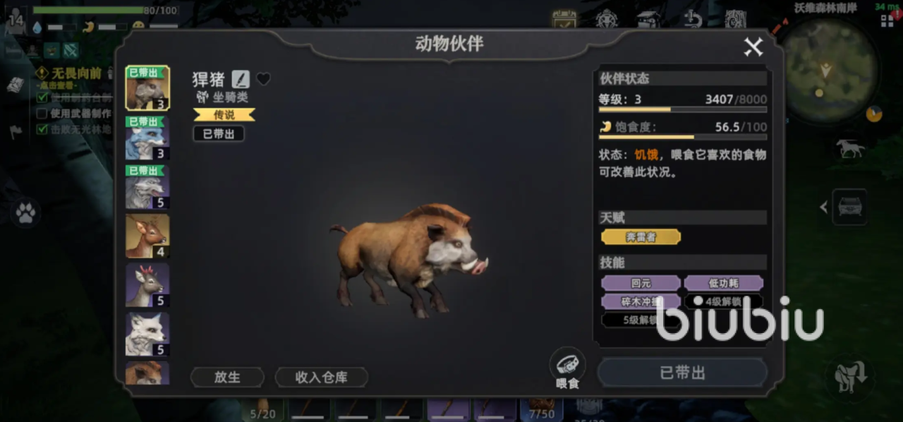 接下来推荐的就是”碎木野猪”,这也是新手朋友不得多得的好伙伴,这个宠物的主要作用就是采集,非常擅长收集木材,前期不管是建设家园,还是说制作工具,木材的需求量都是很大的,它能帮助朋友们快速收集大量木材,加快发展进度。