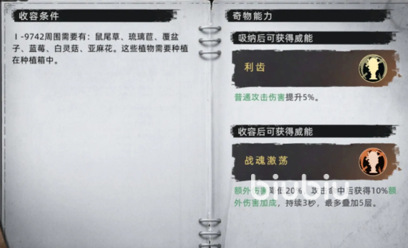 成功收容之后,它在未激活的状态下,能让我们的普攻伤害提升5%,激活也就是摆放在植物箱之中,会让伤害降低20%,但可以叠加5层伤害,每层都会让伤害提升10%,提升3秒的时间,利用这个特点大家可以在面对敌人之际,可以先通过普攻来叠加层数,后续打出更高的伤害。