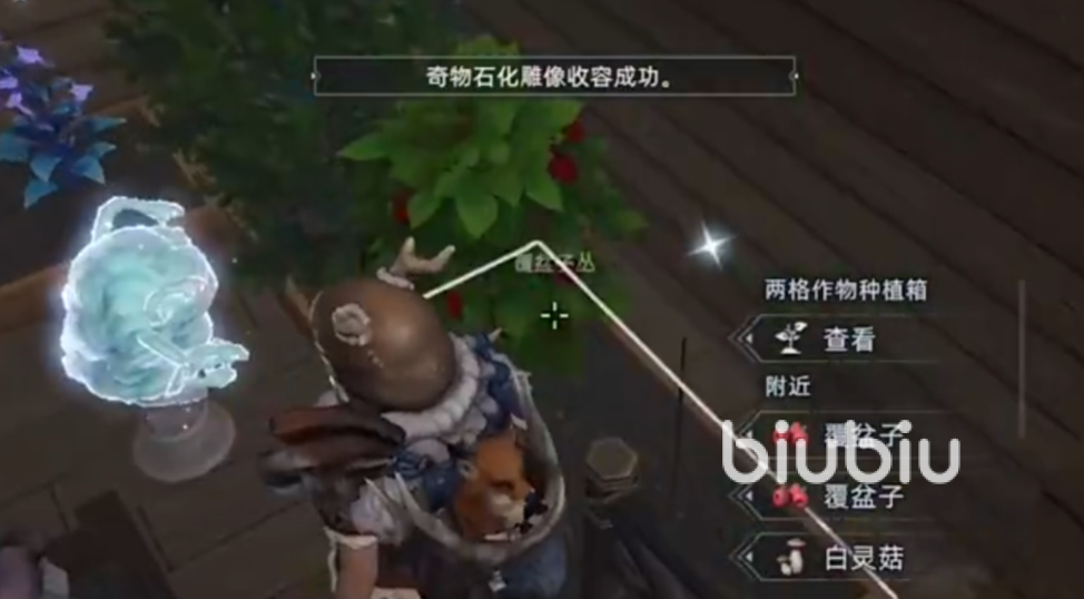 成功击败后boss会掉落石化雕像,但此时它还未收容成功,我们需要在其周围摆放上覆盆子、鼠尾草、白灵菇、亚麻花、蓝莓菇、琉璃苣这六种植物,需要注意一定要将这些植物种植在种植箱中,否则是不会起作用的。