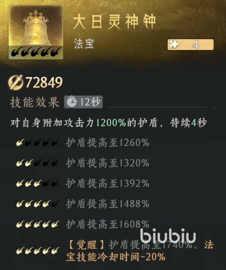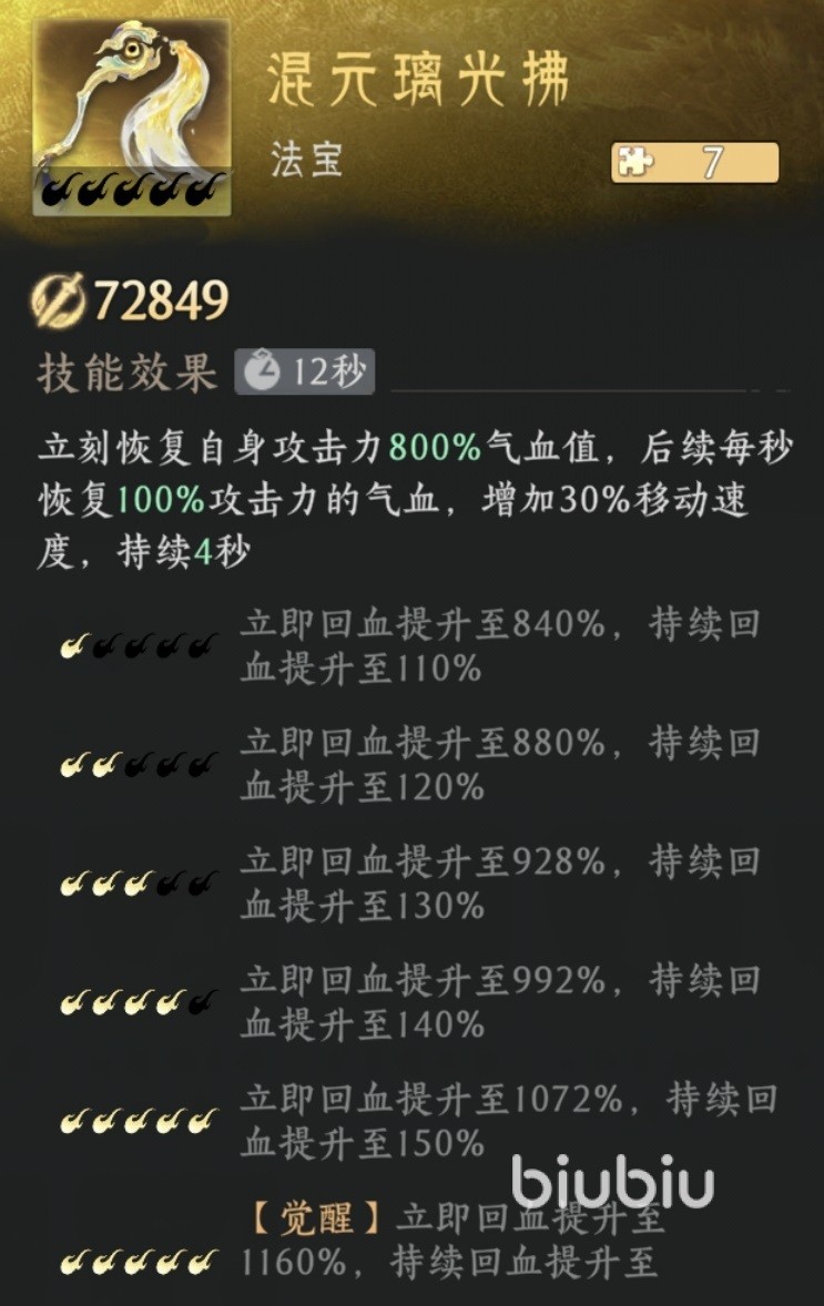 第三个推荐的是防御型大日灵神钟,效果是对自身附加高额护盾,在这款游戏中护盾是非常有效的防御类状态。开启护盾后可以让自身能扛更多伤害。第四个推荐的是混元璃光拂,是属于辅助型法宝,使用后立即恢复大量生命值,后续还会持续恢复生命值,并增加移动速度。移动速度提升后更方便我方进行走位和进行各种操作,恢复的血量配合上法宝提供的护盾能够提高生存。