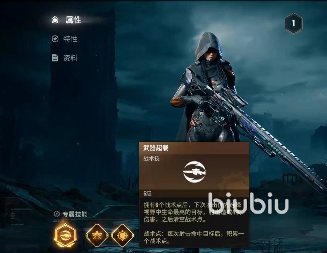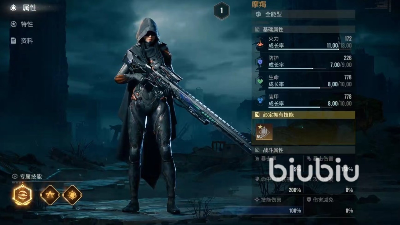 外观上面来看,摩羯非常炫酷,手中拿着一把巨大的狙击步枪,这也展现出了她的特点和精确射击有着极密切关系。在基础属性方面,火力成长率非常高,装甲、生命属性也较为突出。第1个专属技能是战术技武器超载,拥有6个战术点后,下次攻击优先选择视野中血量最高的目标,造成4次伤害之后将战术点清空。在每次命中目标后都会积累战术点。