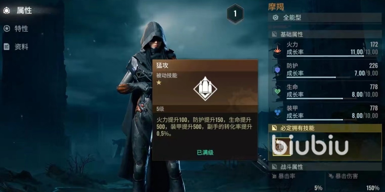 这一项被动可以配合另外的专属技能一起生效,造成非常出色的射击杀伤效果。另外他还会必定拥有一个技能猛攻,同样是被动效果,大幅度提高火力属性、防御属性以及生命、装甲和副手转化率等。通过这些技能效果不难看出,在目前为止所有的伙伴中,如果论射击输出能力,那么摩羯绝对排名一流。如果大家现在感觉自身输出有些缺失,可以使用摩羯来进行弥补。