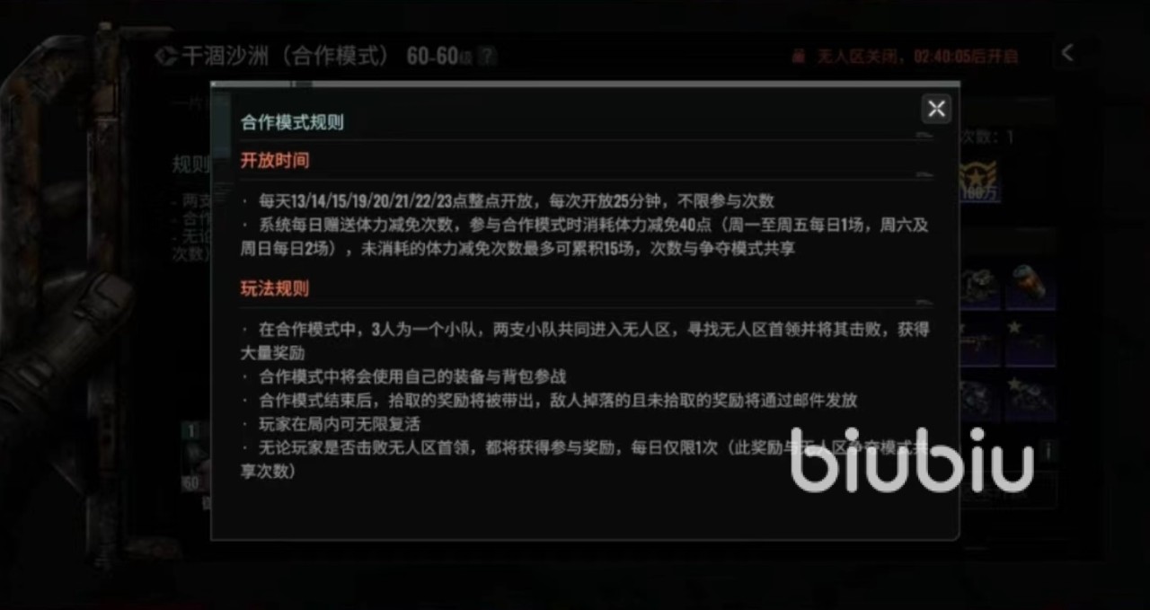 在合作模式中有一定的规则,三名玩家组成一个小队,两个小队共同进入无人区,需要在其中将首领找出来,并将其击败可获得大量奖励。在此模式中将会使用自己的装备和背包参与战斗,在活动结束后拾取到的奖励被带出来,如果敌人掉落奖励没有及时拾取,也会通过邮件的形式发送,所以不用担心满地道具来不及捡拾的问题。在局内还可以无限制复活,无论大家是否将无人区首领击败,都可以获得参与奖励,但每天仅限一次。