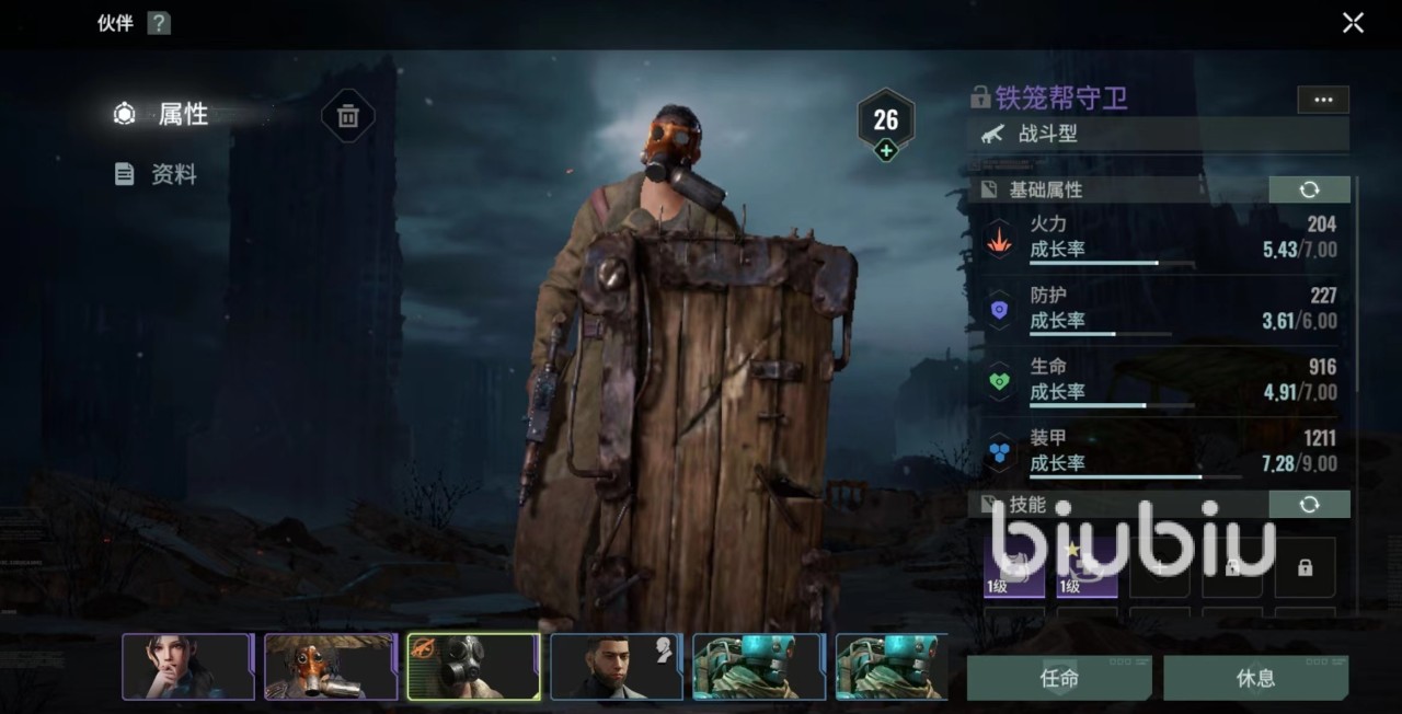 首先推荐的是铁笼帮守卫,该角色属于战斗型,自身手持巨大盾牌,外观非常凶悍。在属性方面装甲成长率非常高,这就意味着它可以硬扛很多伤害,事实也确实如此,该伙伴简直成为肉盾战神,高护甲高血量,大盾还有伤害减免效果,另外每隔一段时间还会释放嘲讽技能,强制对方攻击自身。