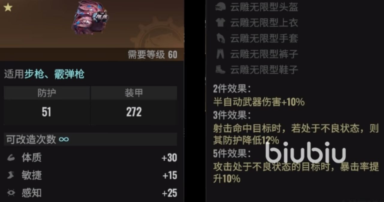 云雕无限型是60级金色装备,套装效果是:二件套半自动武器伤害加10%;三件套效果涉及命中目标时,若处于不良状态,则使其防护降低12%;五件套效果攻击处于不良状态的目标,暴击率提升10%。